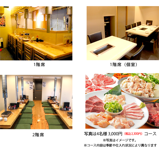 特選和牛使用 量より質コース ※ご予約は3名様〜 ・きのこサラダ(特製ドレッシング) ・自家製キムチ盛り合わせ ・厚切り特上タン ・厚切り上ハラミ ・和牛のにぎり(二貫) ※コース限定メニュー ・箸休め 肴 ・炙りウチモモ ・ミスジ サンチュ巻き ※コース限定メニュー ・サブトンすき焼き風 ・牛テールおじや ※コース限定メニュー |
